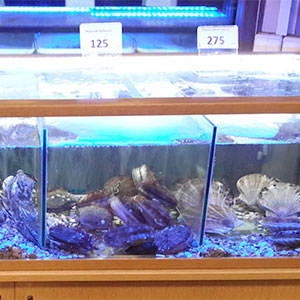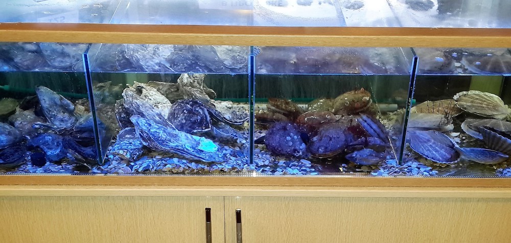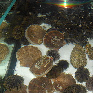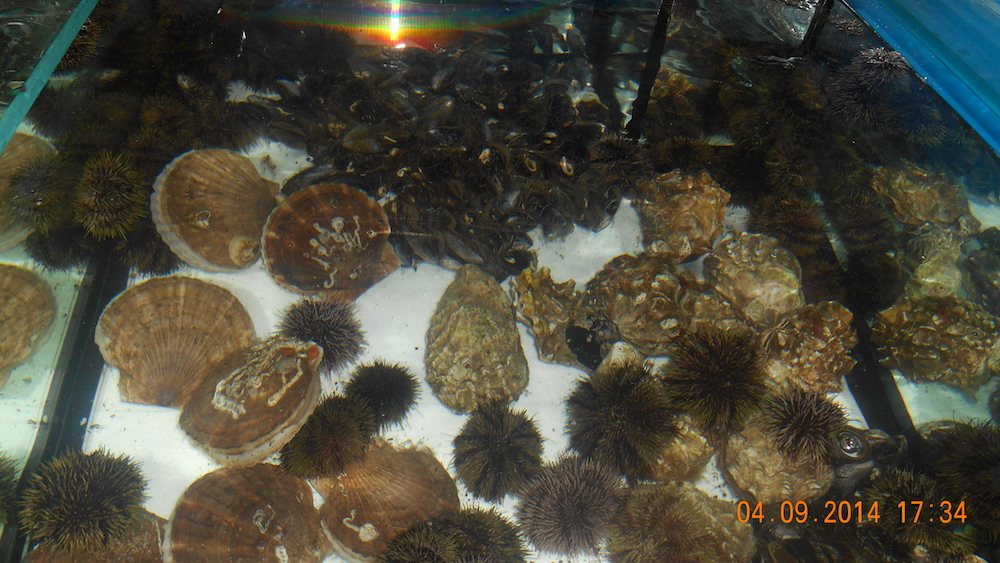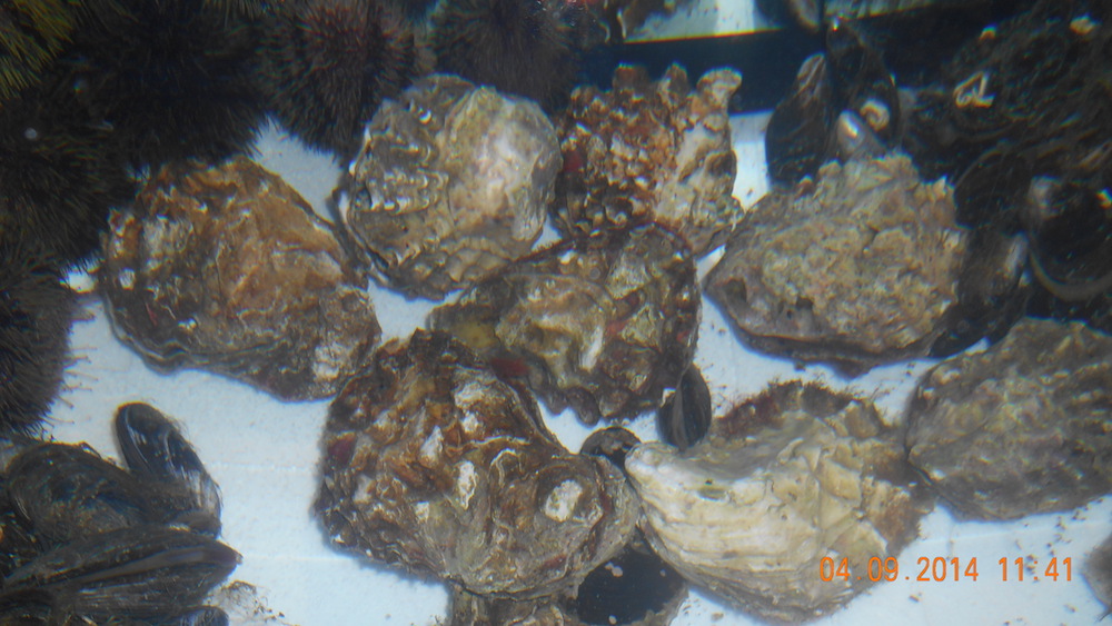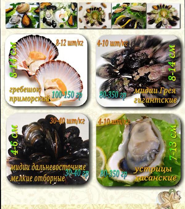 - живые морепродукты - устрицы, морские ежи и гребешки, крабы;